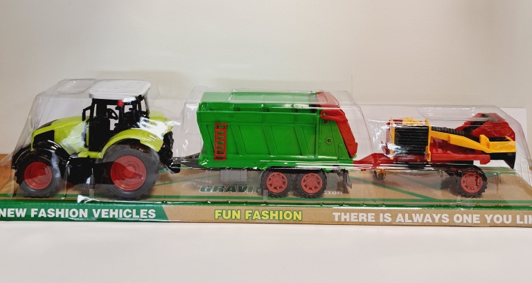 Traktorius su priekaba ir ūkio padargu