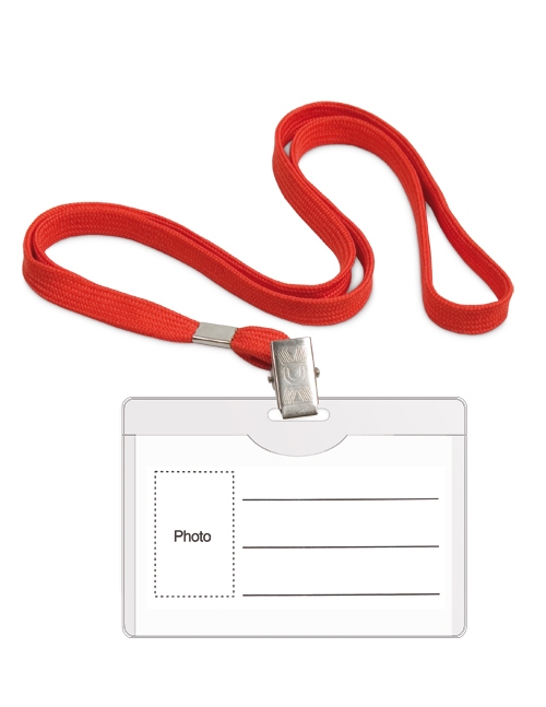 Pagaminta iš tvirto plastiko. Horizontali. Matmenys: 54 x 90 mm. Su metaliniu spaustuku, skaidri, su raudonu dirželiu, pakuotėje 50 vnt.