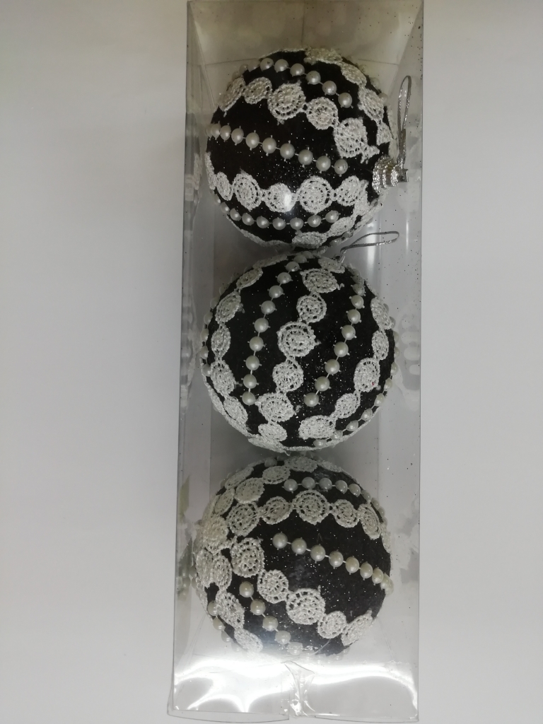 Žaisliukas eglutei juodas 7.5cm x 3vnt su ornamentais ir perliukais