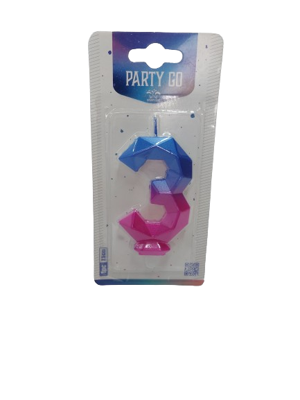 Žvakė tortui skaičius "3" mėlyna-rožinė spl. 7,5 cm