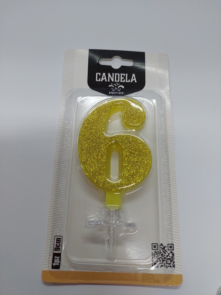 Žvakė tortui skaičius "6" aukso spl. bizgus 9 cm.