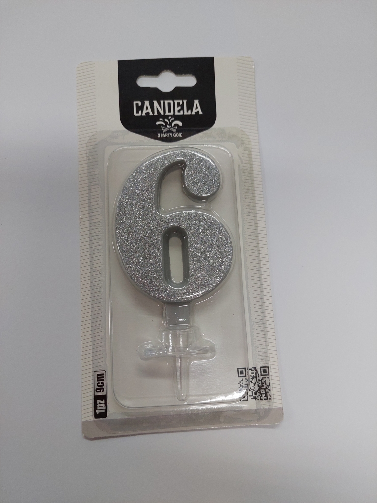 Žvakė tortui skaičius "6" sidabro spl. bizgus 9 cm.