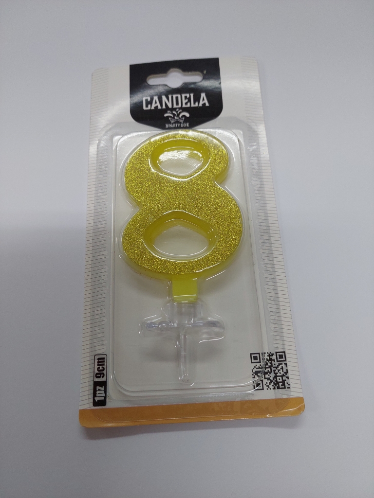 Žvakė tortui skaičius "8" aukso spl. bizgus 9 cm.