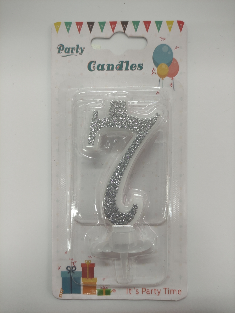 Žvakutė ant torto, skaičius 7, su sidabro sp. blizgiu apvadu