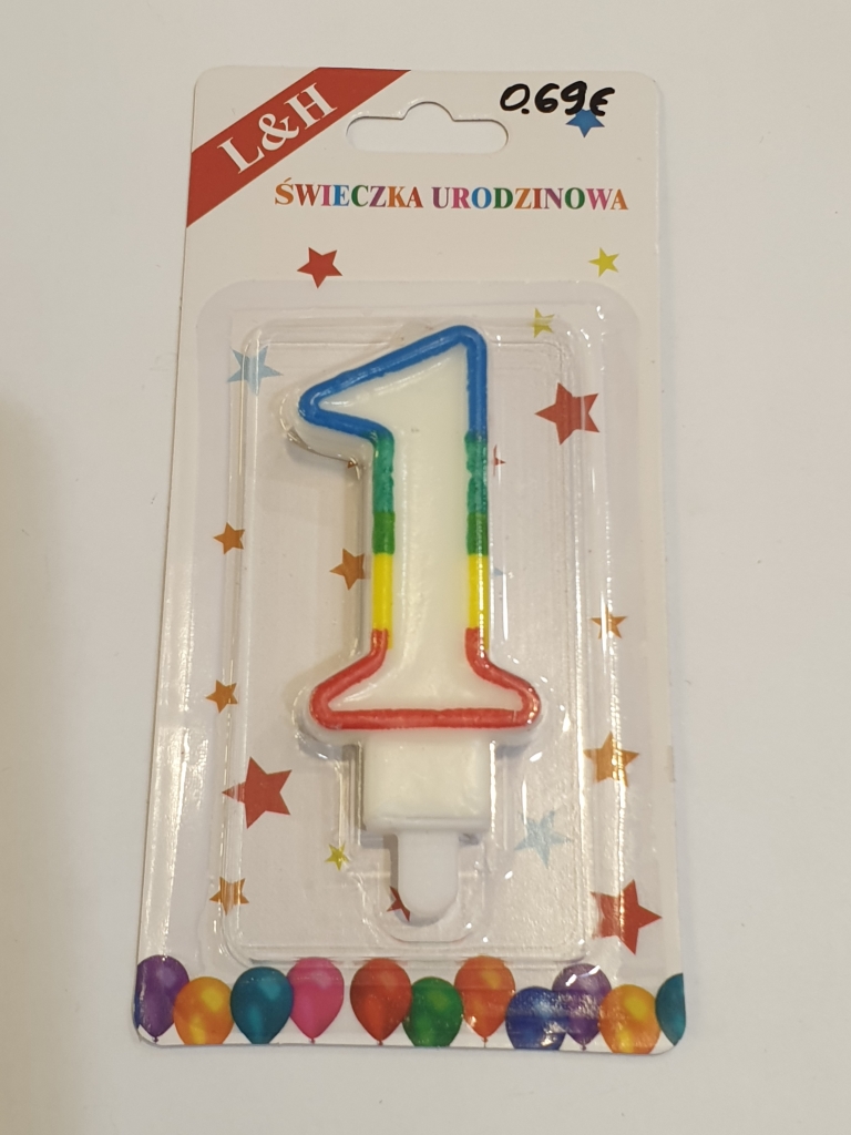Žvakutė skaičiukas 1 ant torto įvairiaspalviu apvadu