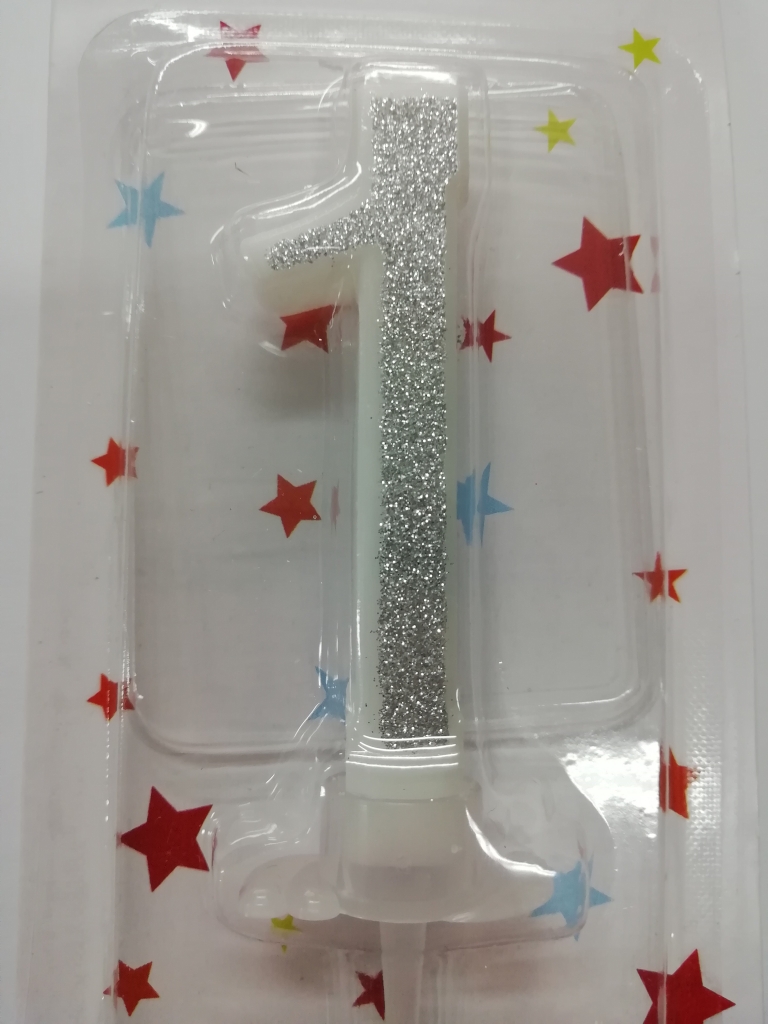 Žvakutė skaičiukas 1 ant torto sidabro spalvos apvadu