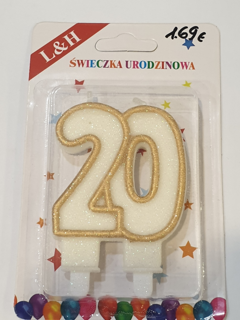 Žvakutė skaičiukas 20 ant torto įvairiaspalviu apvadu
