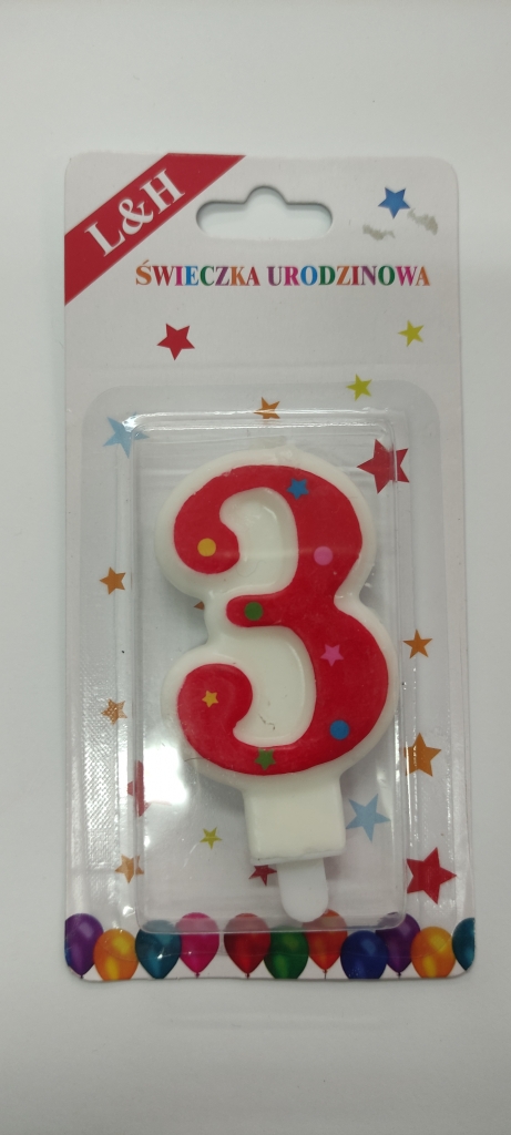 Žvakutė skaičiukas 3 ant torto raudonos spalv.