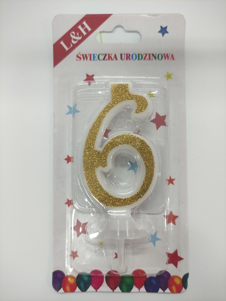 Žvakutė skaičiukas 6 ant torto aukso spalvos apvadu