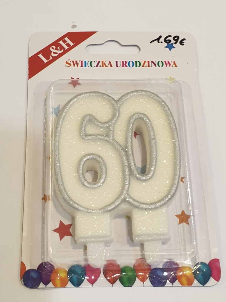 Žvakutė 60 skaičius, ant torto papuošimui, įvairiausių spalvų ir atspalvių.