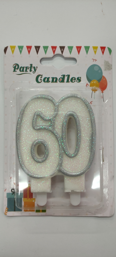 Žvakutė skaičiukas 60 ant torto sidabro spalvos apvadu