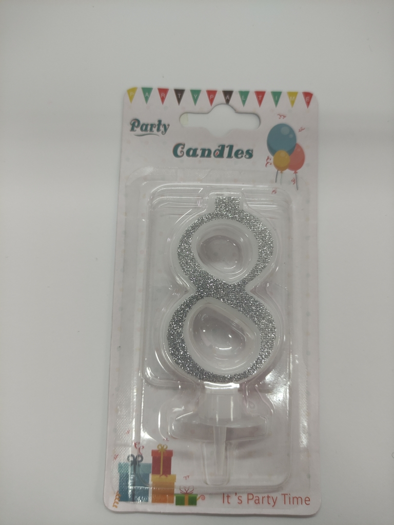 Žvakutė skaičiukas 8 ant torto sidabro spalvos apvadu