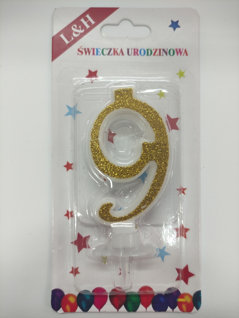 Žvakutė skaičiukas 9 ant torto aukso spalvos apvadu